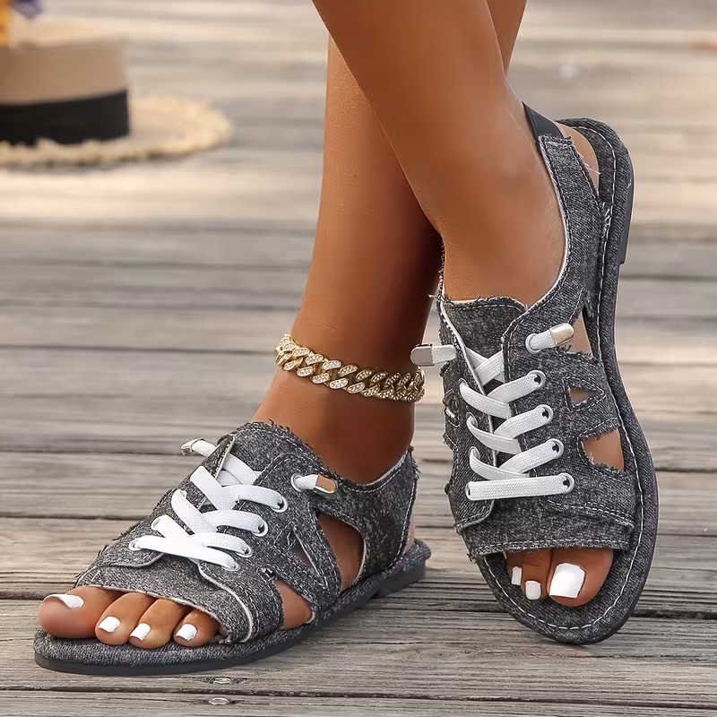 Walk all day in effortless style. These denim lace-up sandals fuse a classic sneaker silhouette with an open-toe, flat-sole design — giving your feet the freedom they deserve without sacrificing looks. Built for women who want comfort and Bohemian flair in every step.